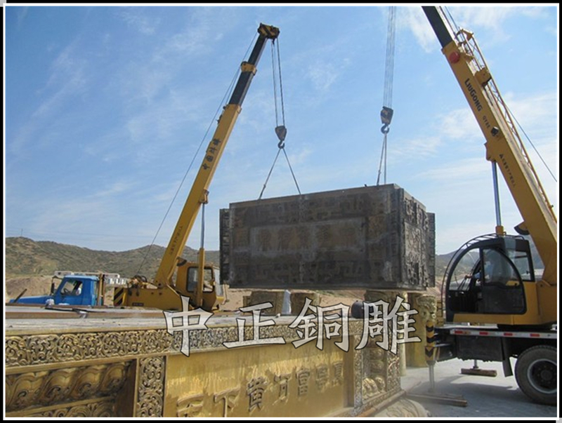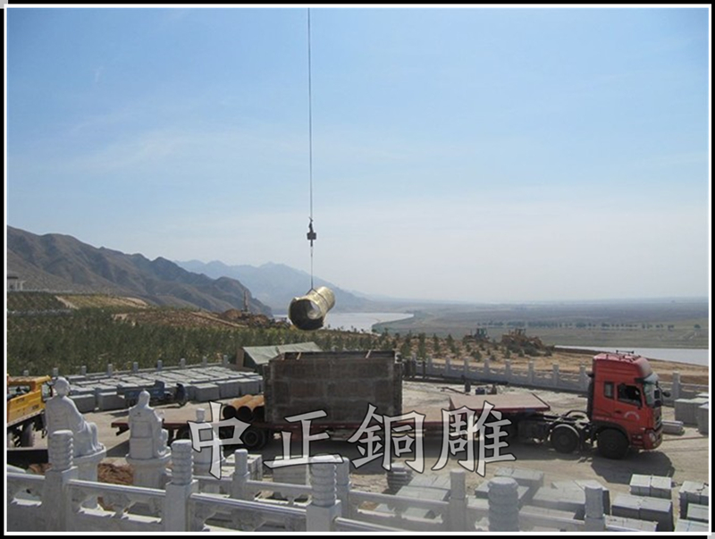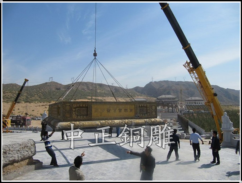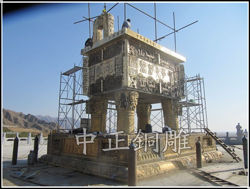 安裝于寧夏青銅峽《中華黃河壇》景區(qū)的中華黃河鼎,銅鼎高6.3米,黃銅澆筑,分塊焊接,紋飾精雕細(xì)琢,氣勢(shì)恢宏,總重13800公斤。歷時(shí)5個(gè)月完工。